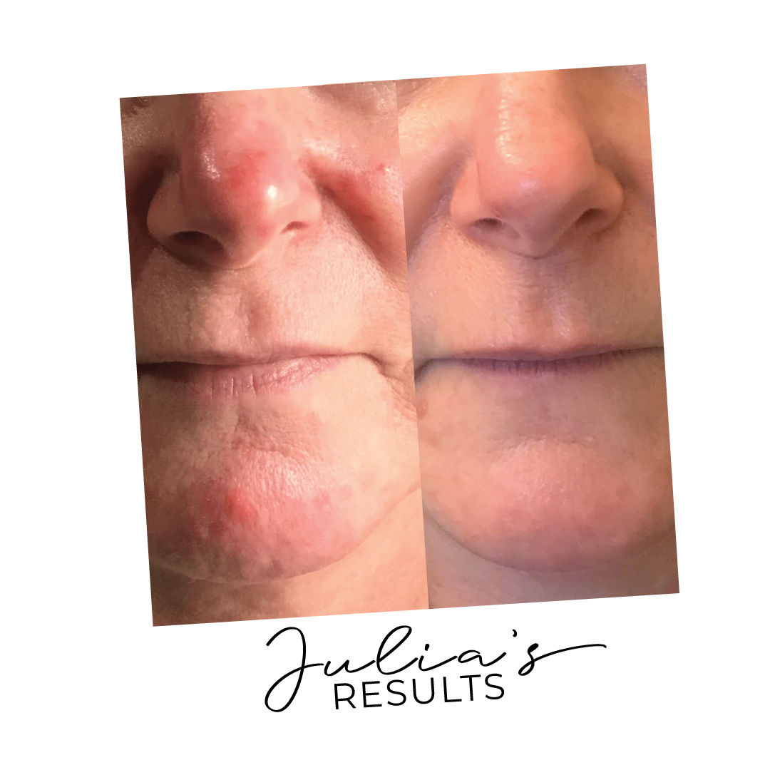 • Julia sent us her wow factor results after just 3 weeks of using our Dragons Blood Collection. Her sensitive skin was dramatically reduced, along with fine lines and wrinkles in the chin and cheek area.